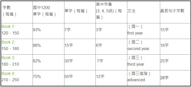 每冊分級主要針對字數、字級、文法、句子長度來區分: