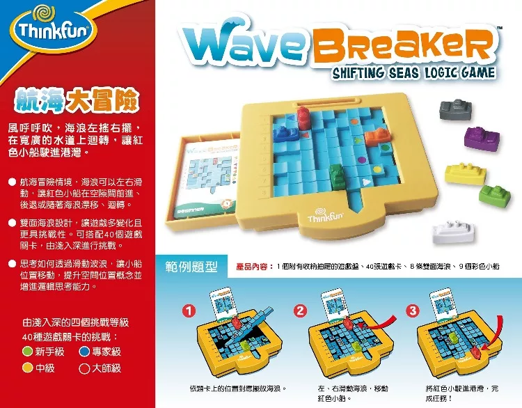風呼呼吹,海浪左搖右擺,紅色的小船被吹出了港灣,快來想想辦法,隨著風浪搖擺,在寬廣的水道上迴轉,讓紅色小船駛進港灣。雙面海浪設計,讓遊戲多變化且更具挑戰性。可搭配40個遊戲關卡,由淺入深,透過海浪的左、右滑動,讓紅色小船在空隙間前進、後退或隨著海浪左、右漂移。當遇到寬廣的水道,還可以180°轉向前進。在遊戲中提升空間位置概念並增進邏輯思考能力。